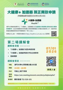 澳大創新創業中心(國家級眾創空間)科技轉化平台正式推出「大健康+」加速器計劃,該計劃在澳門科學技術發展基金的支持下,由澳大創新創業中心執行,由即日起至2026年1月23日接受申請。